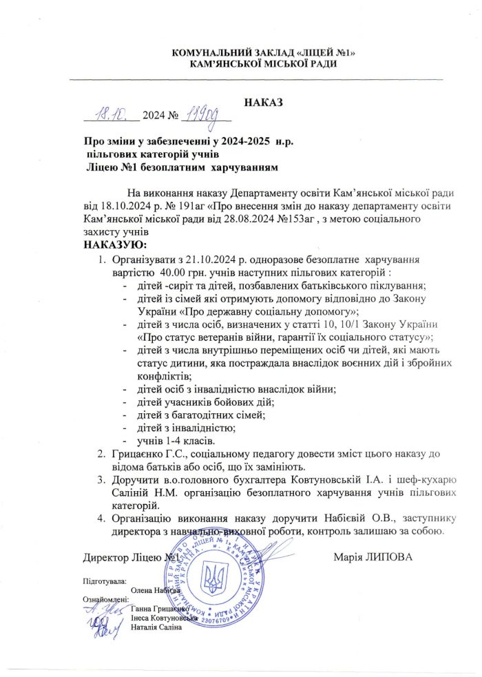 Накази з питань оприлюднення наборів даних у формі відкритих даних, розпорядником яких є Комунальний заклад “Ліцей №1″Кам’янської міської ради
